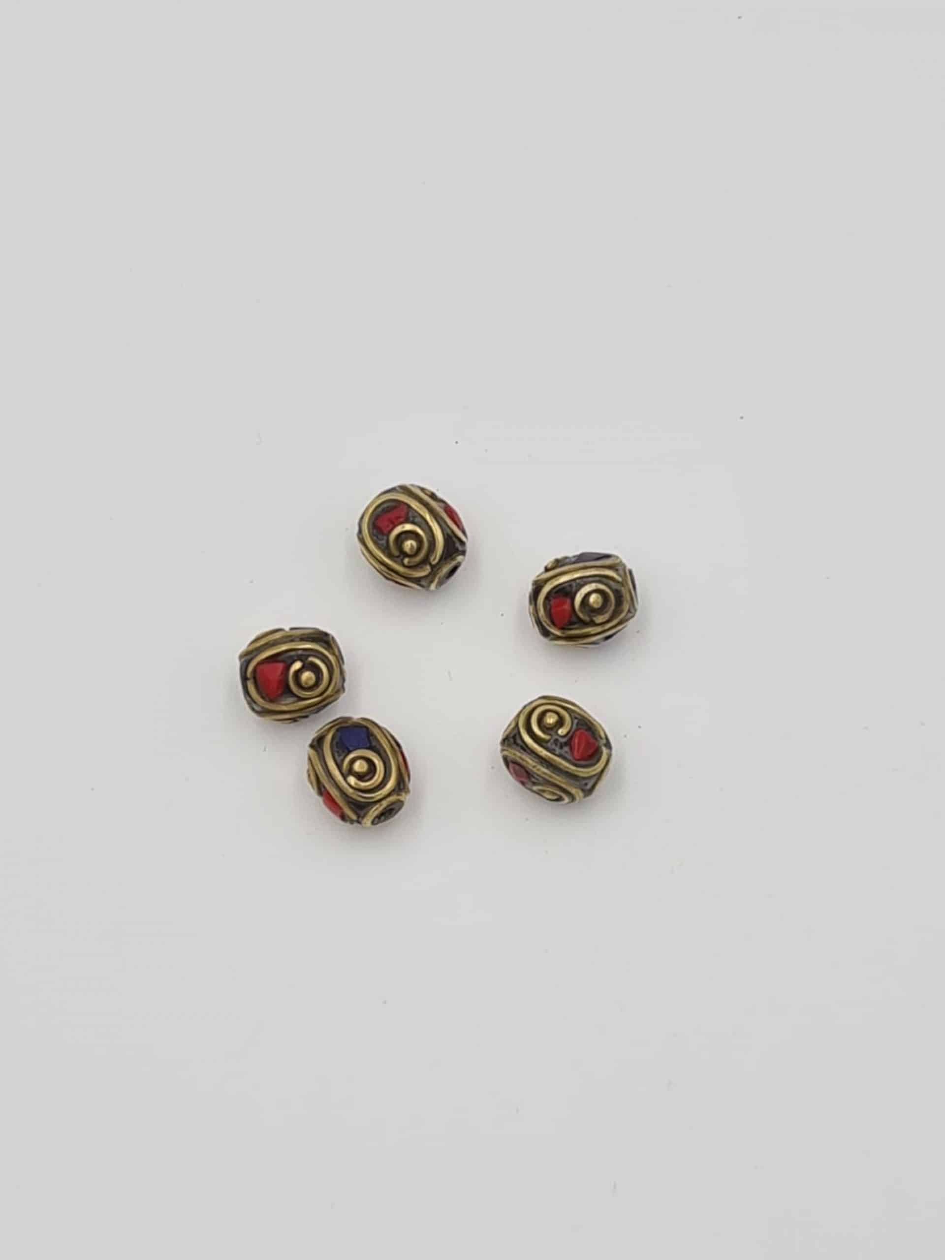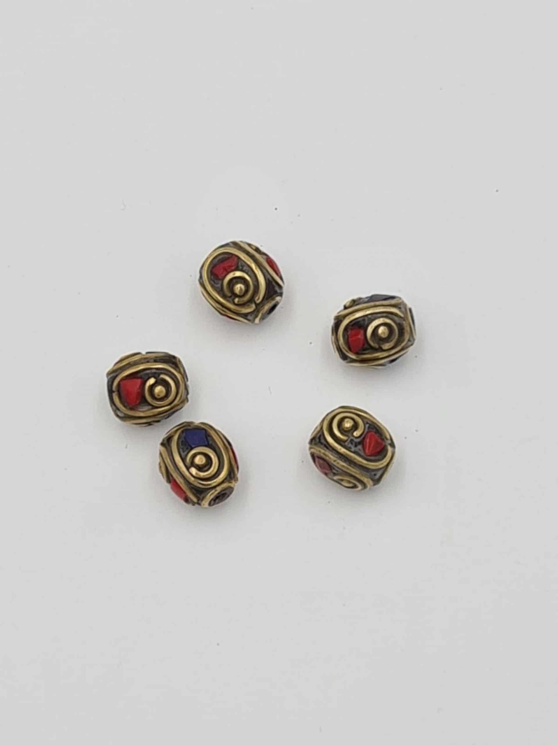 5 Mixed Inlaid Round Beads, Coral Lapiz Lazuli Beads, Ethnic Brass Beads, Ethnic Tribal Beads, Brass Beads, Jewellery Making Beads, Nepal