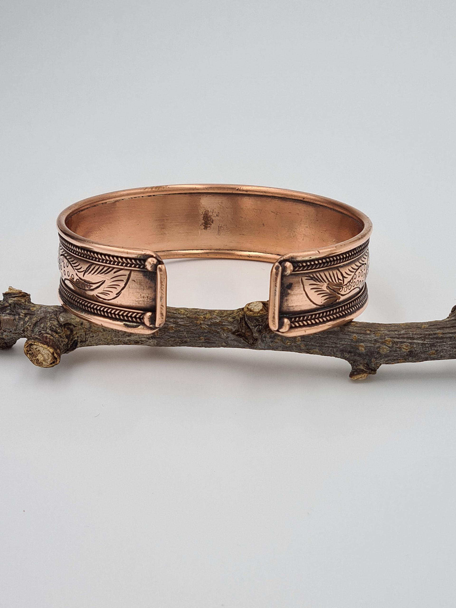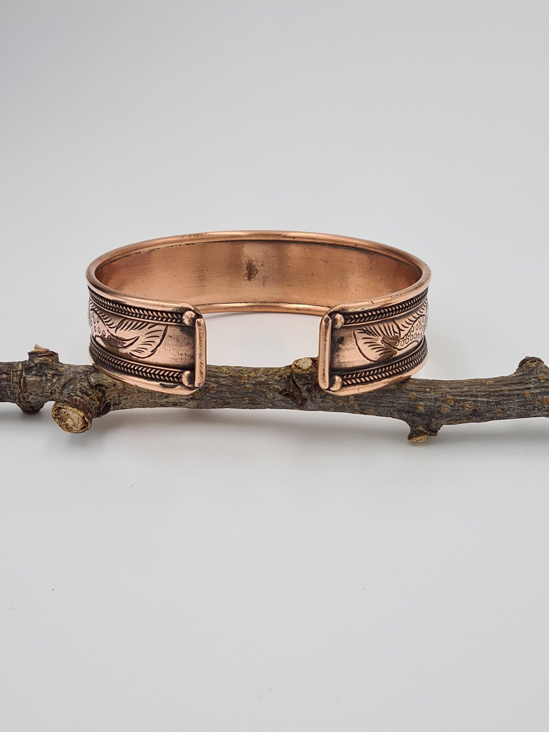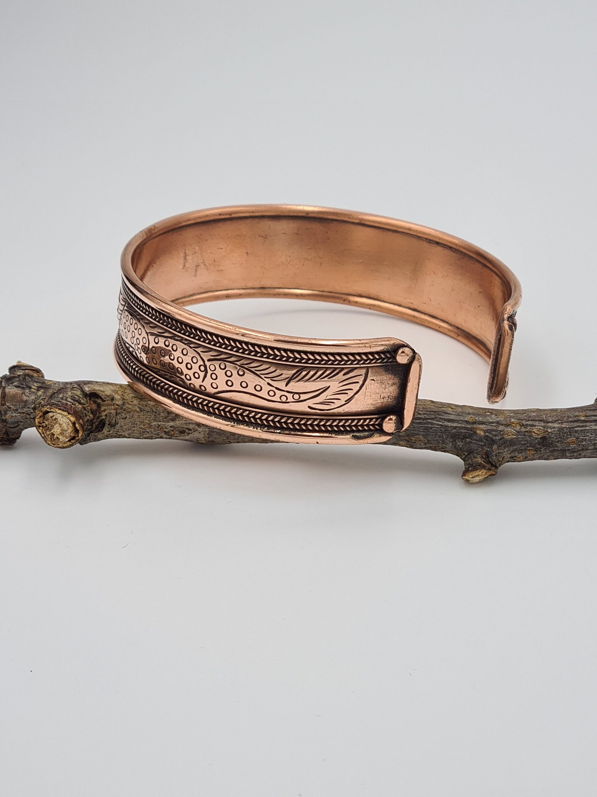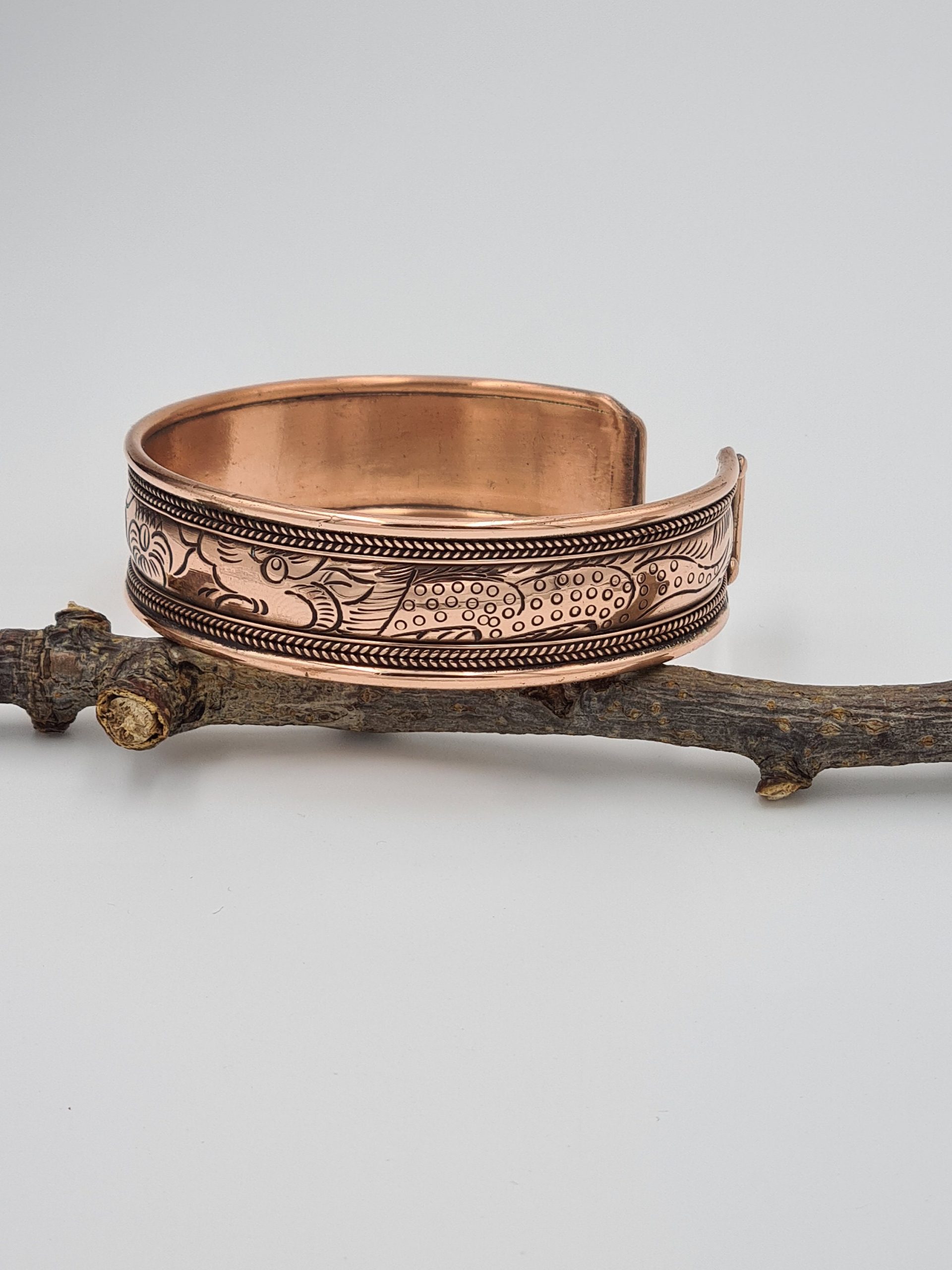This is a stunning ethnic cuff bracelet. It is made from copper. The bracelet is adjustable and but might be suitable for a smaller wrist as well. The bracelet is handcrafted by Nepalese artisans and has engraving of a dragon. It will be a gorgeous addition to your collection if you prefer boho style jewellery.