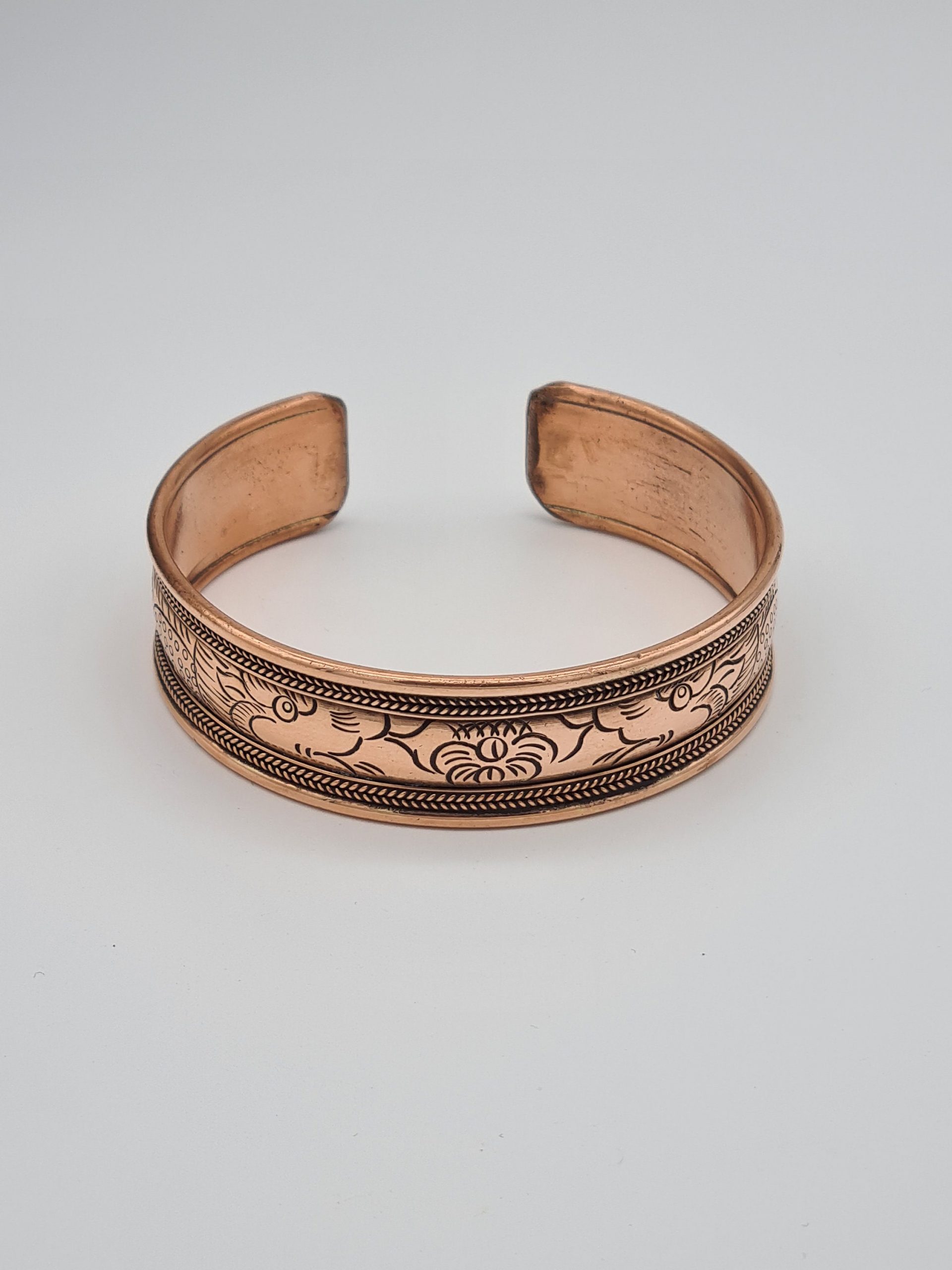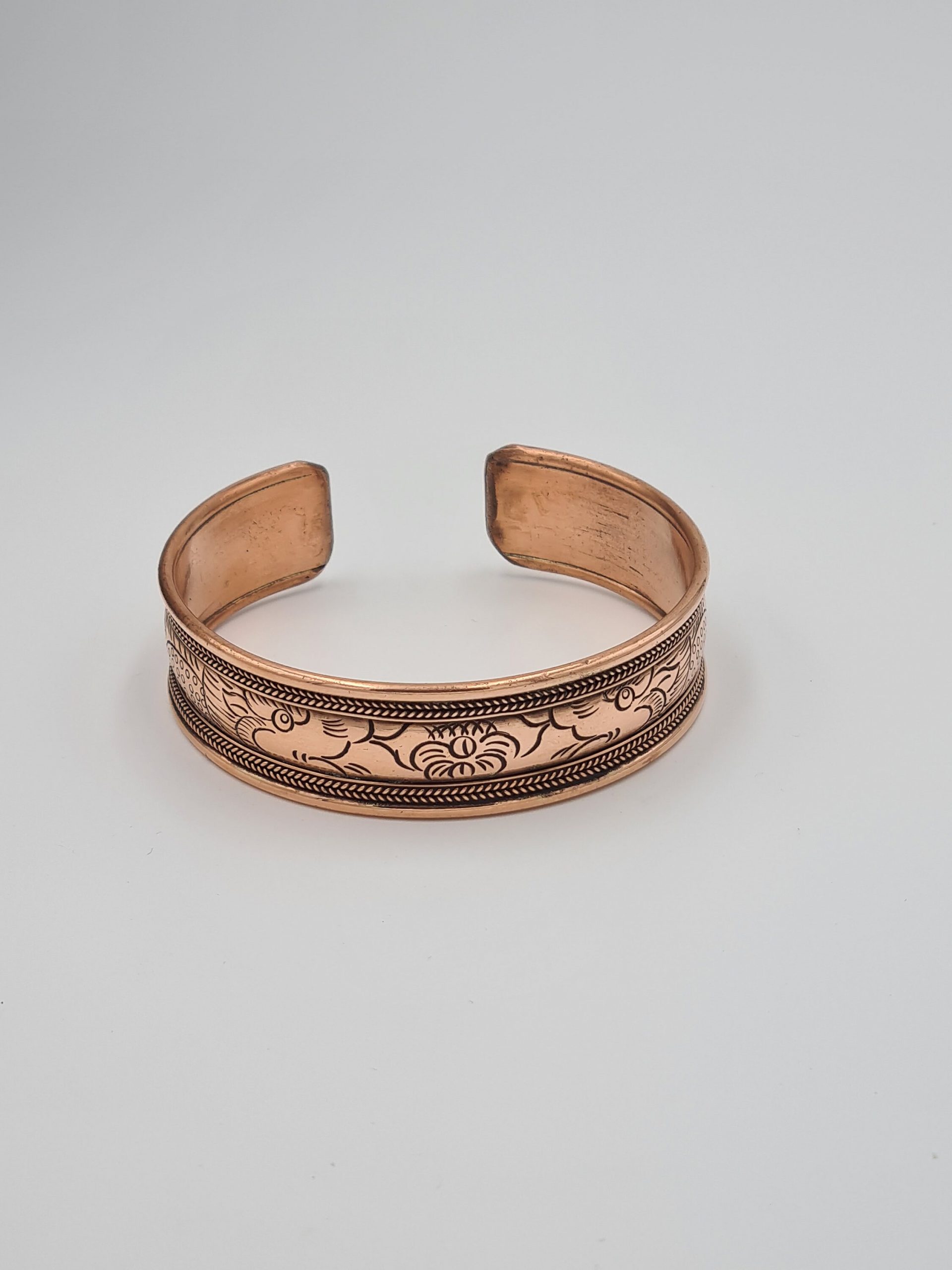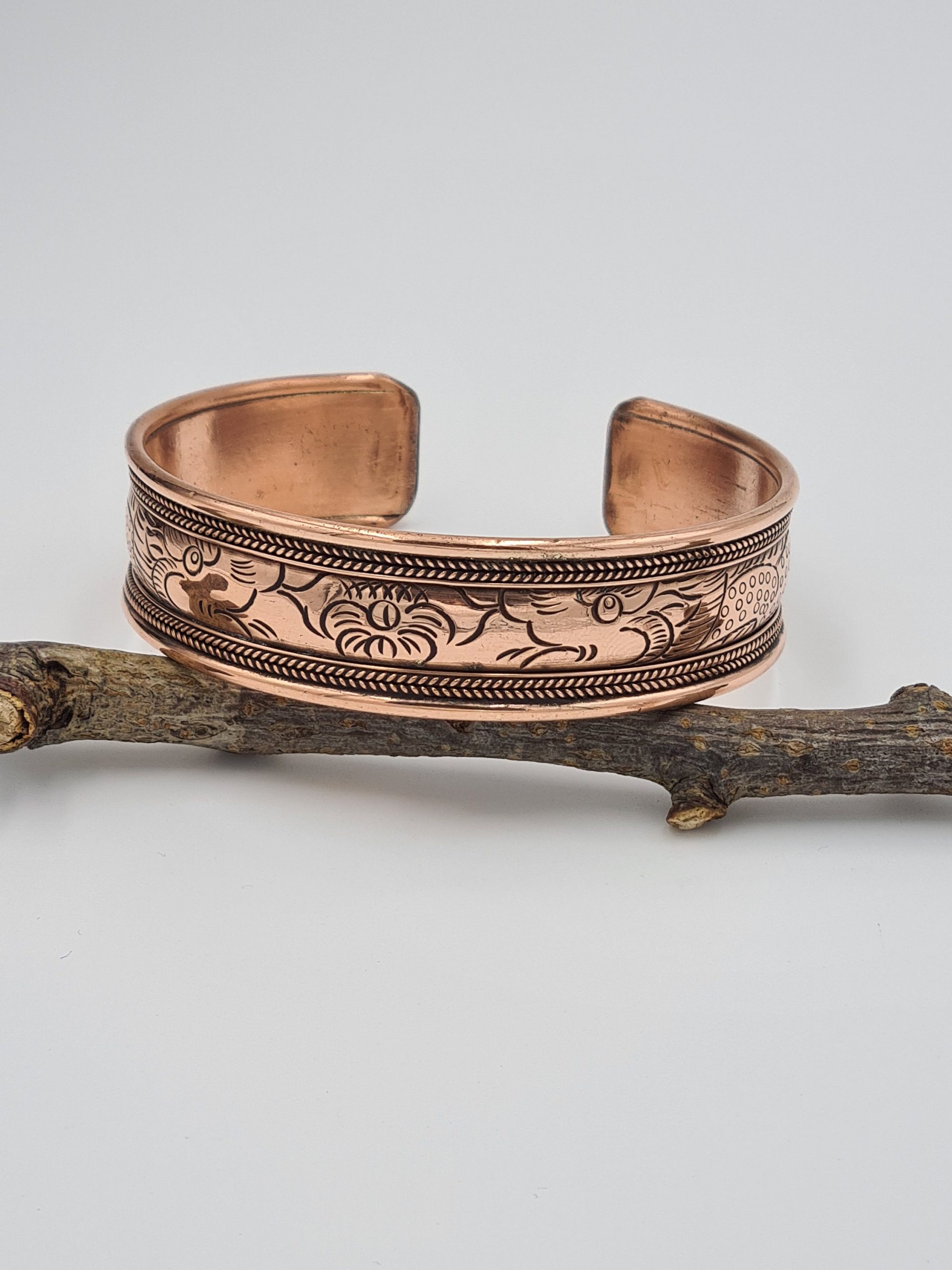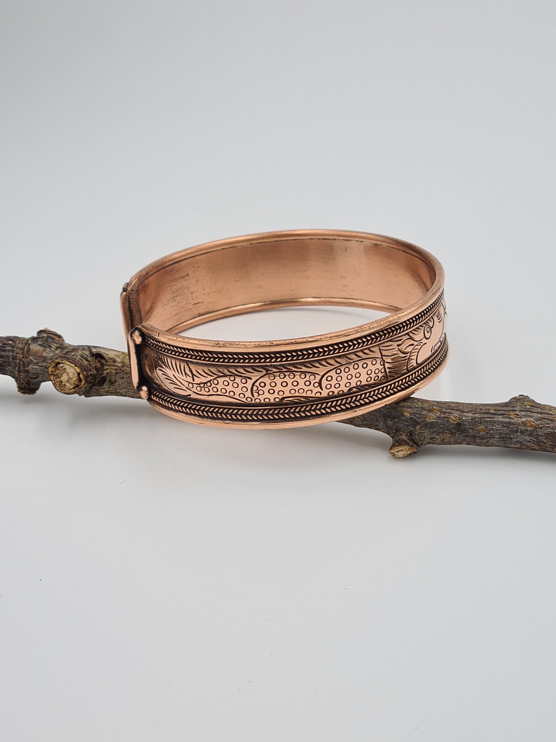 This is a stunning ethnic cuff bracelet. It is made from copper. The bracelet is adjustable and but might be suitable for a smaller wrist as well. The bracelet is handcrafted by Nepalese artisans and has engraving of a dragon. It will be a gorgeous addition to your collection if you prefer boho style jewellery.