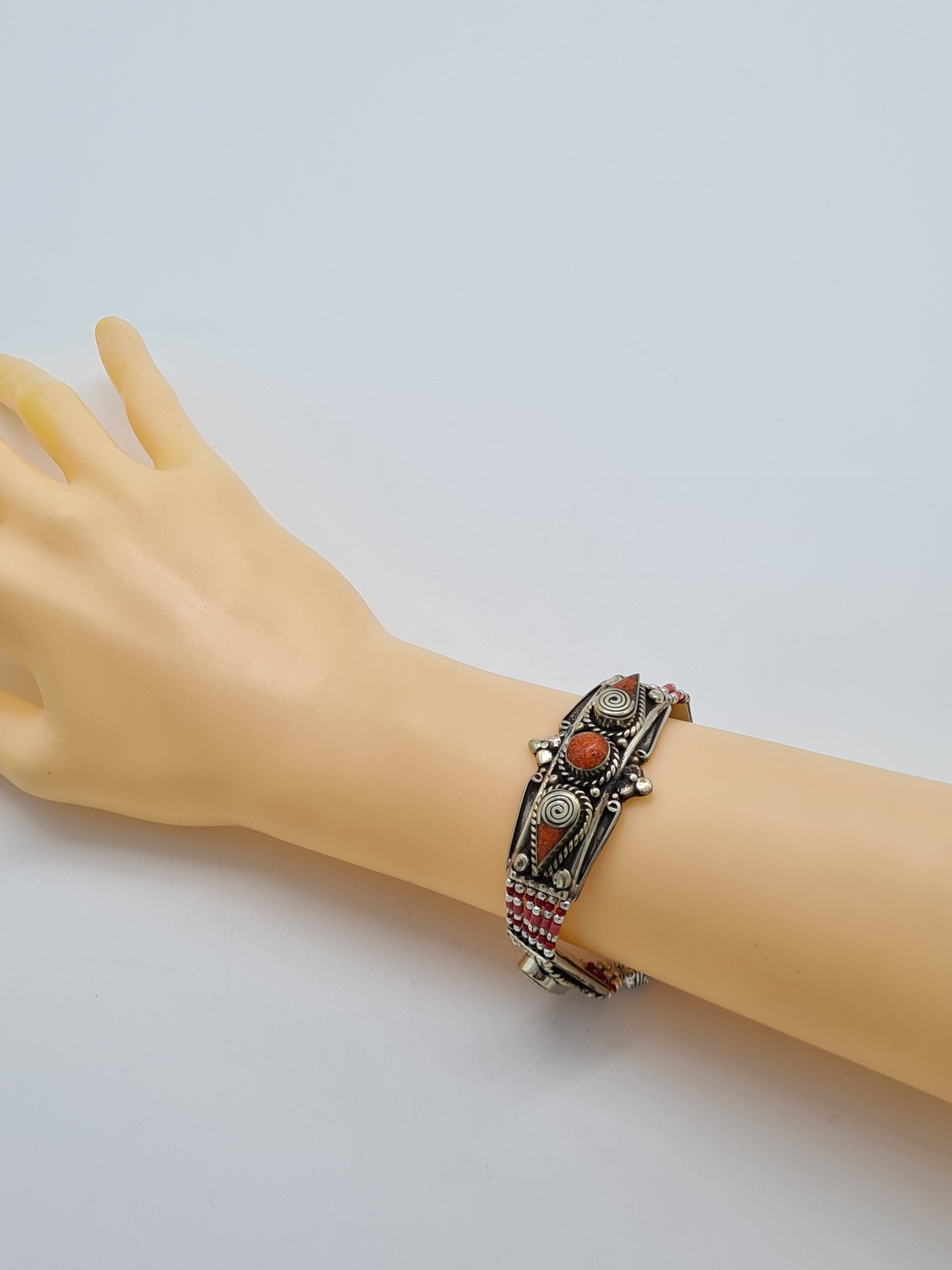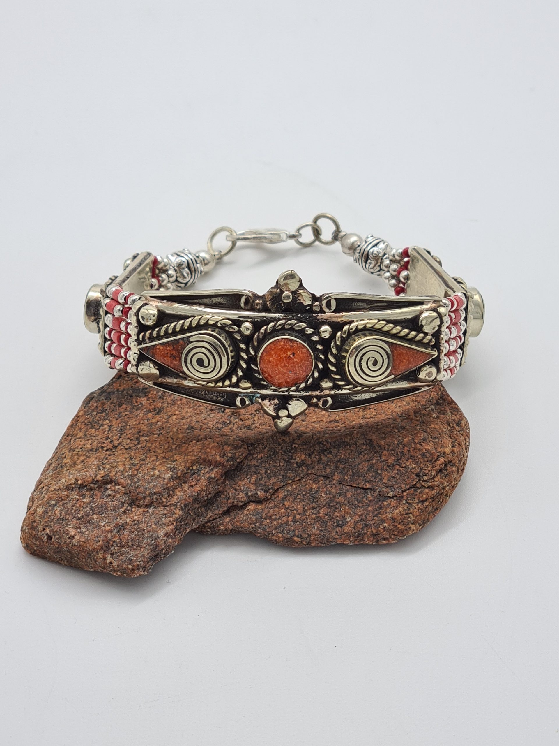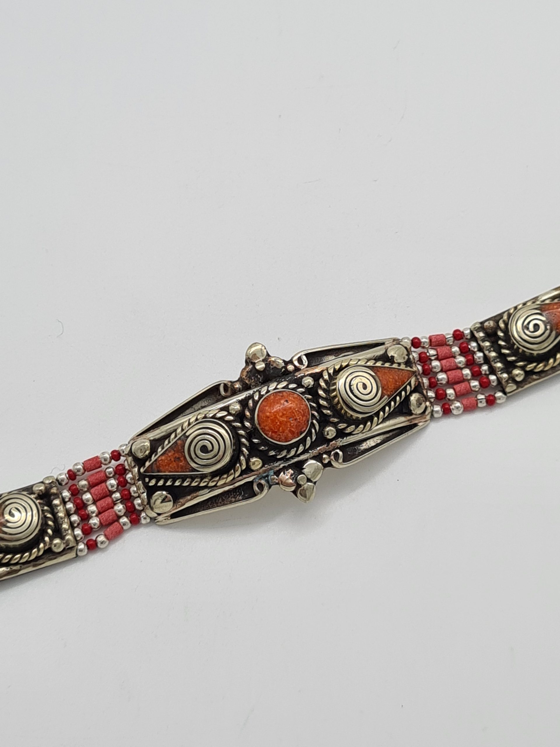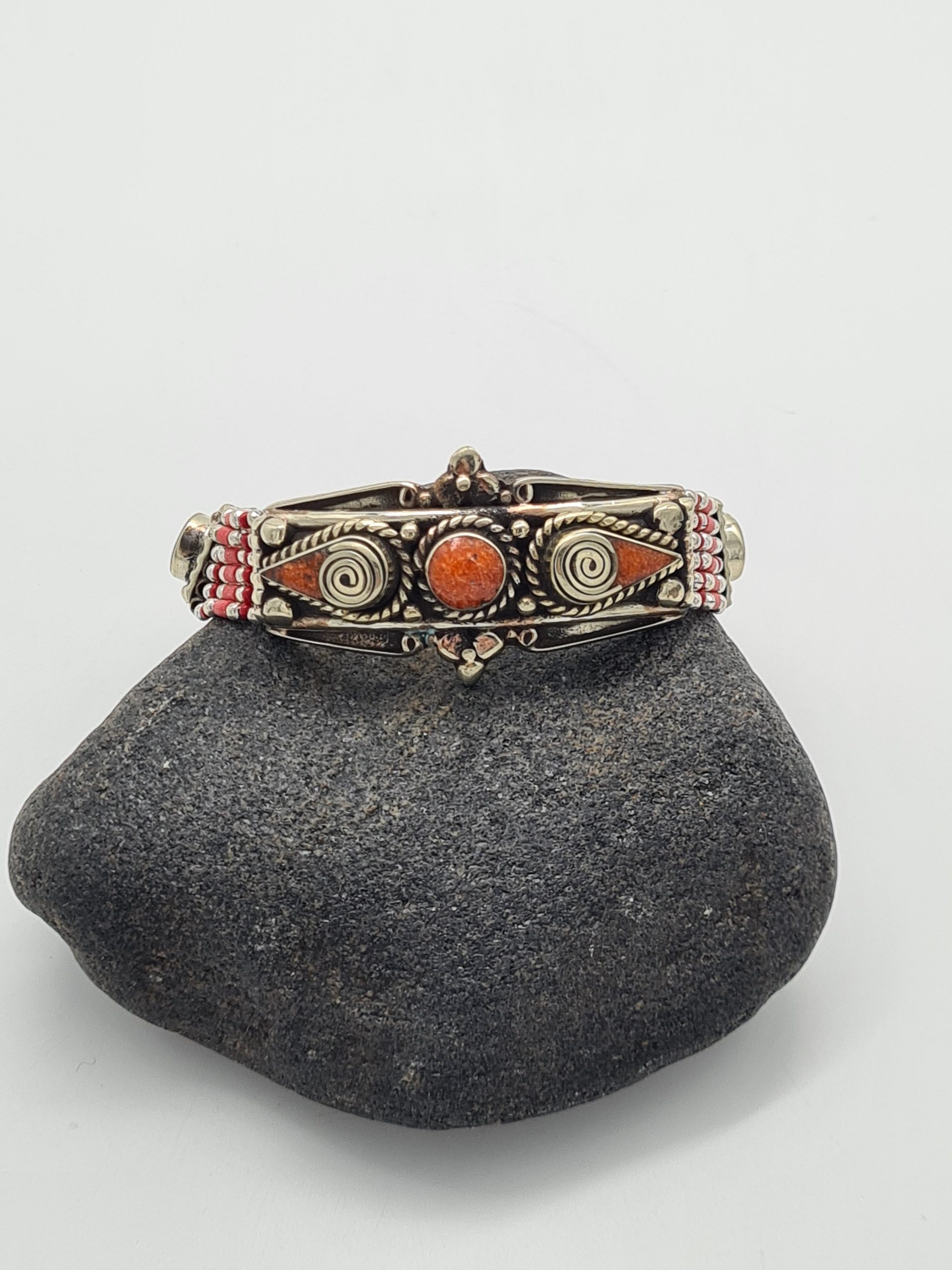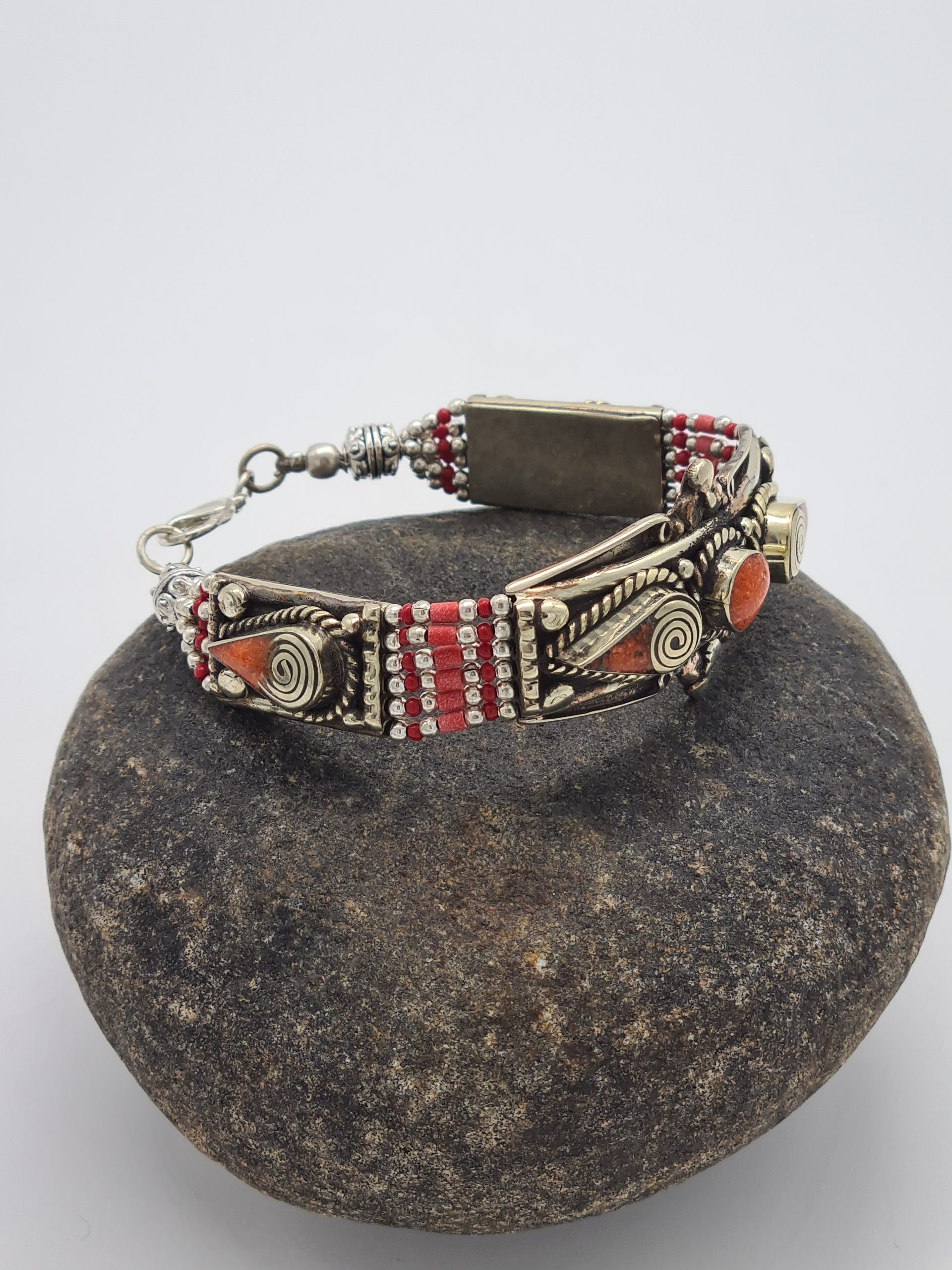 This is a beautiful Nepalese bracelet which is made from Tibetan silver and coral stone. The bracelets are made by Nepalese artisans and are of the highest quality.