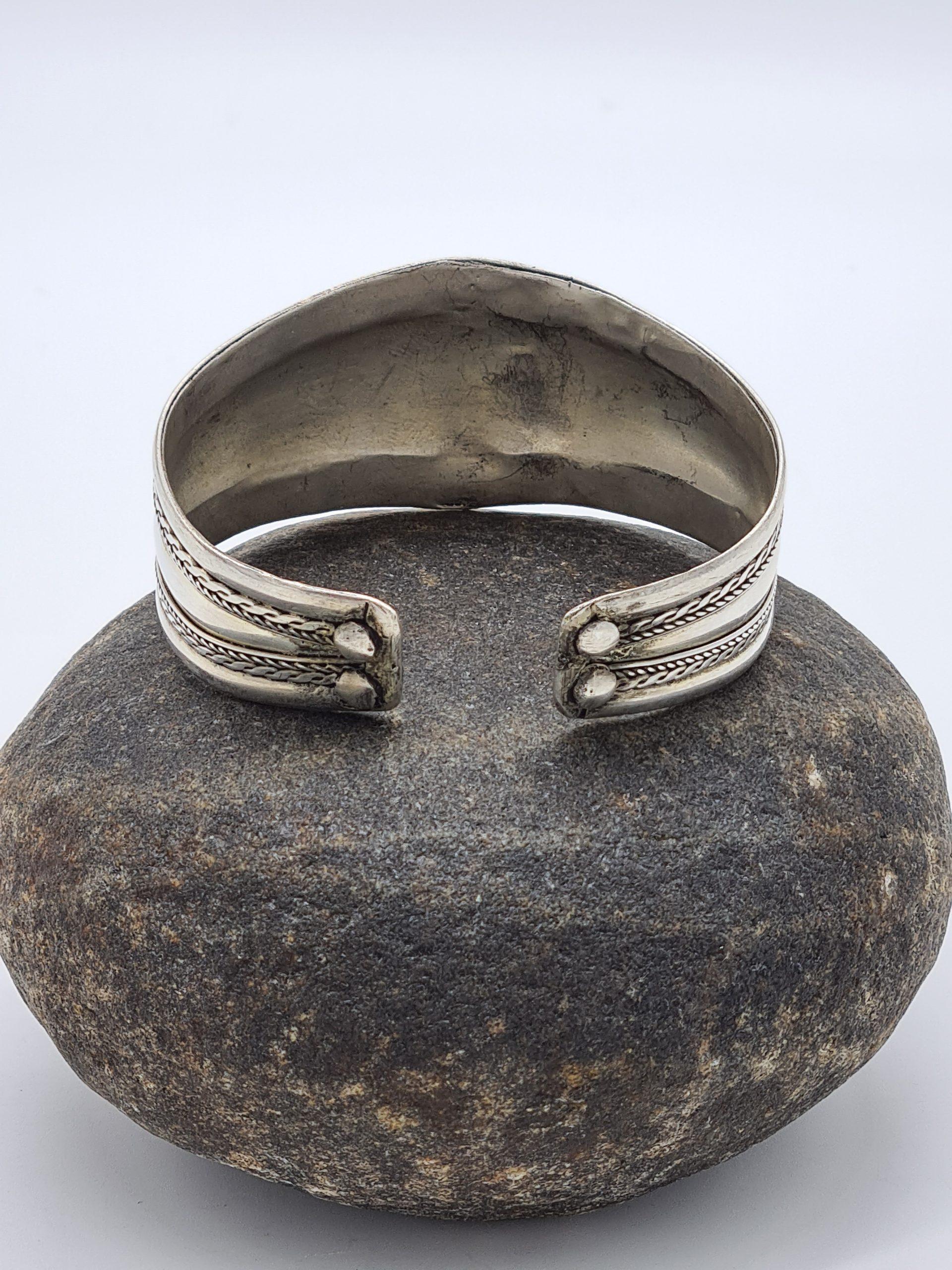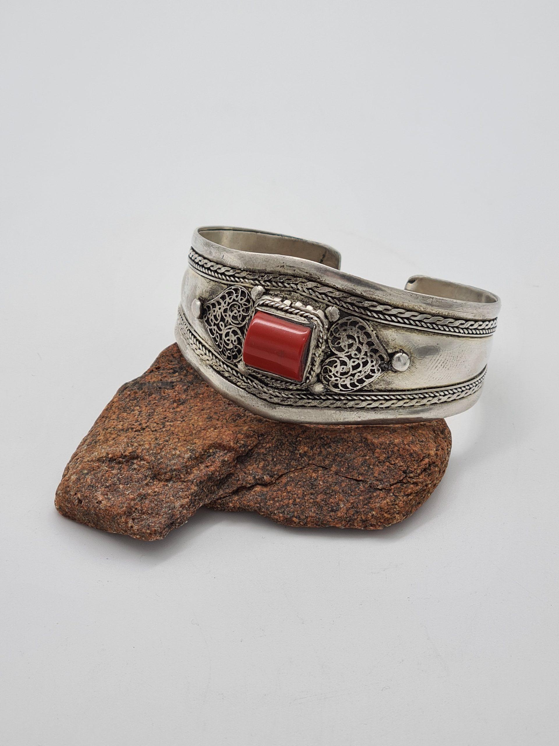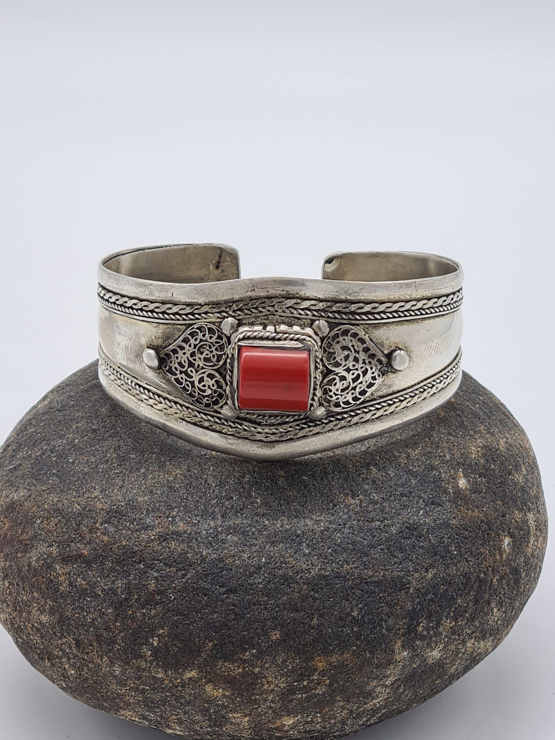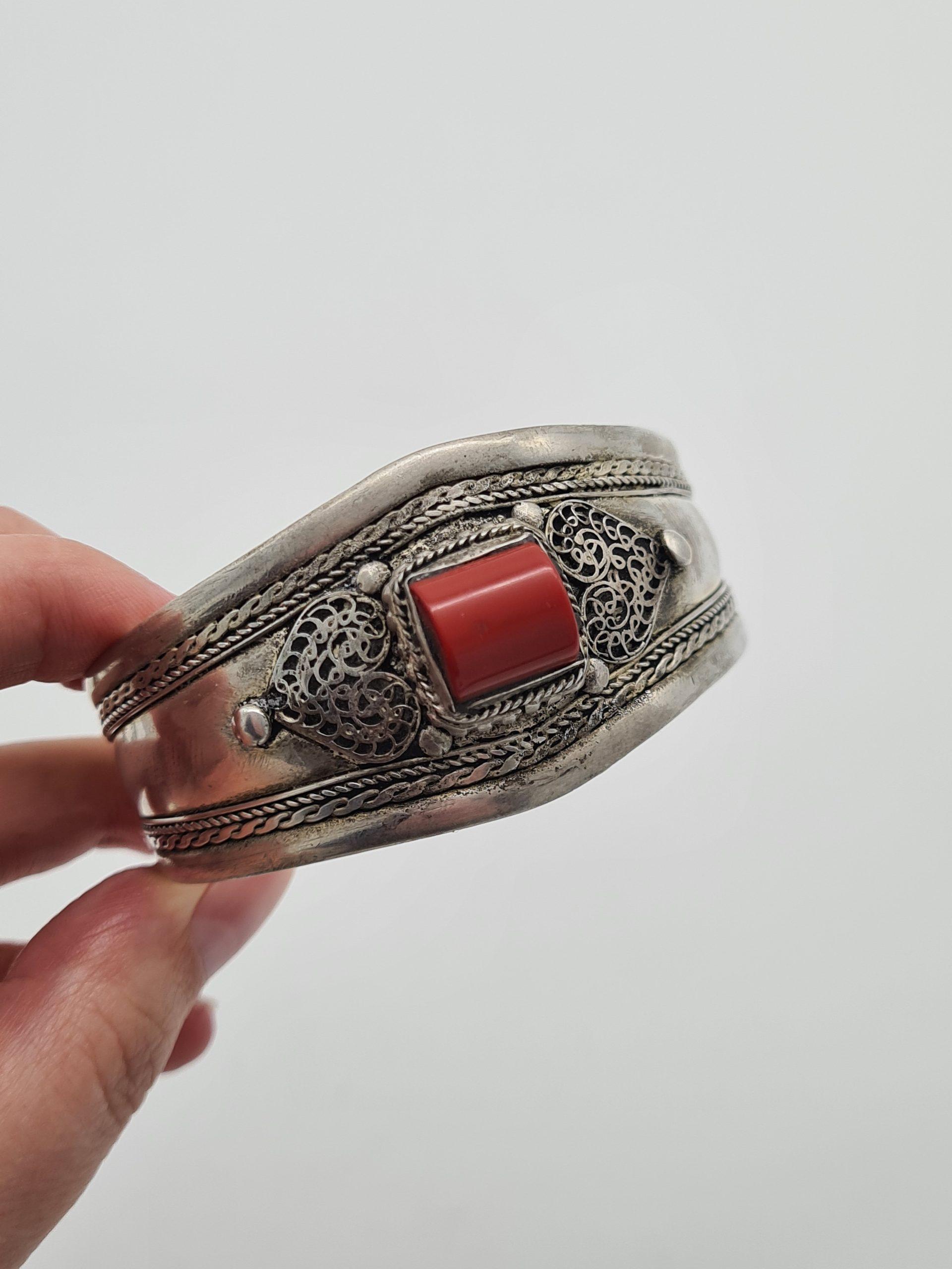 This is a stunning ethnic cuff bracelet. It is made from Tibetan silver (alloy: silver, tin, copper) and coral stone. The bracelet is adjustable and it comes with a pretty pouch.