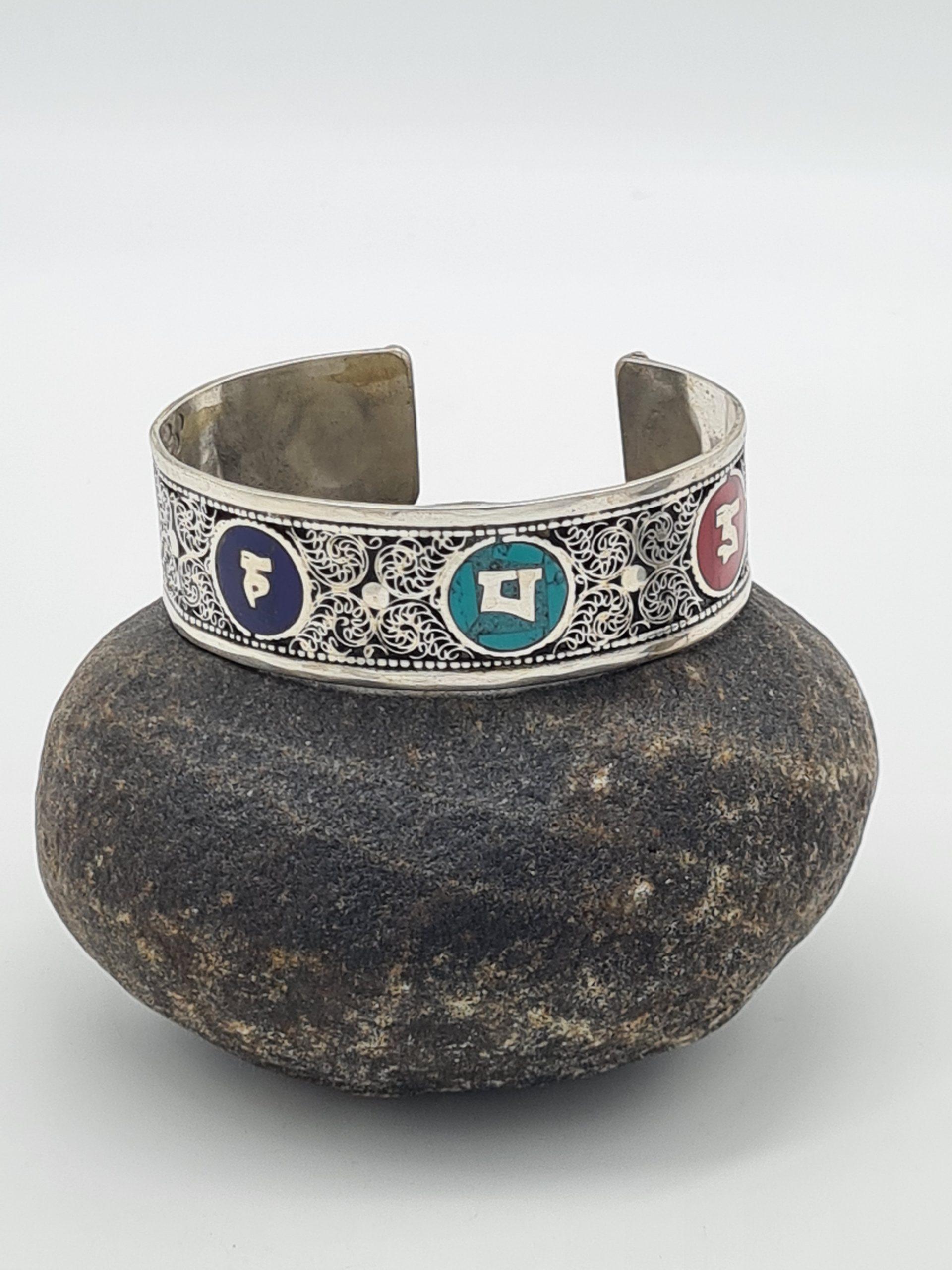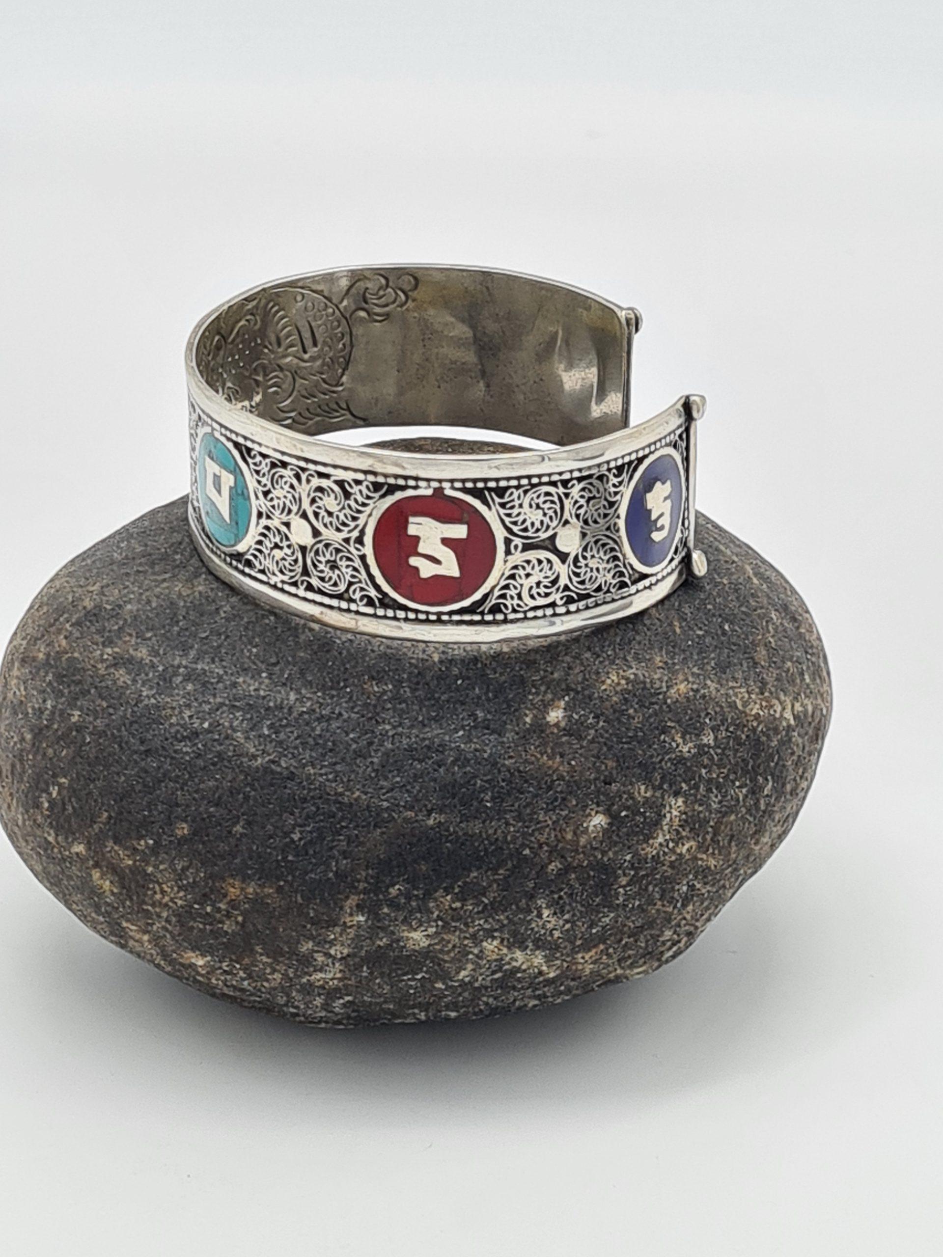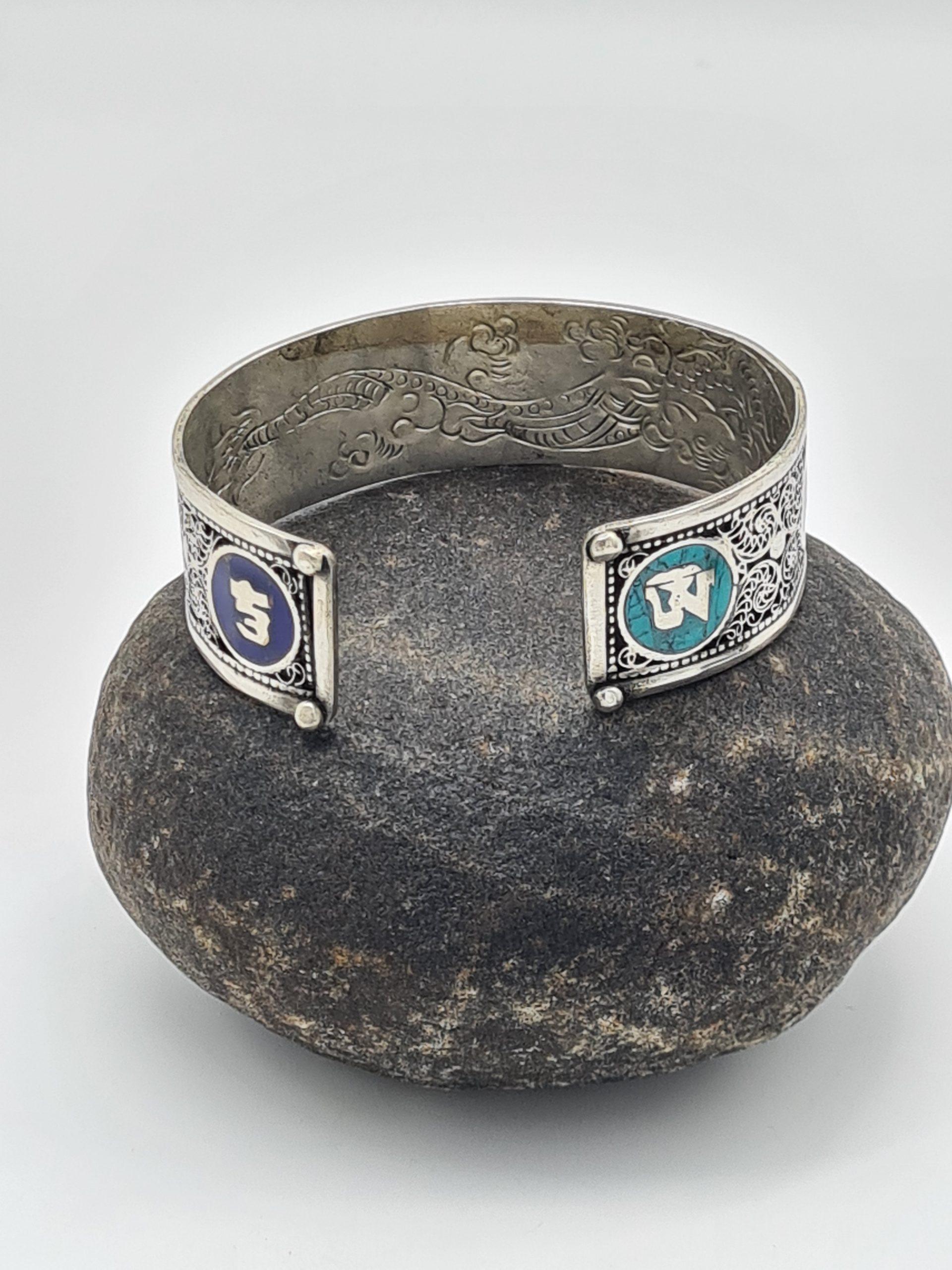 This is a stunning large ethnic cuff bracelet. It is made from Tibetan silver, brass, copper and has coral, lapiz lazuli or turquoise inlay. Each bangle has engraving of the dragon inside. The bracelet is adjustable, however it might be too large for a smaller wrist. Each bracelet comes with a pretty pouch.