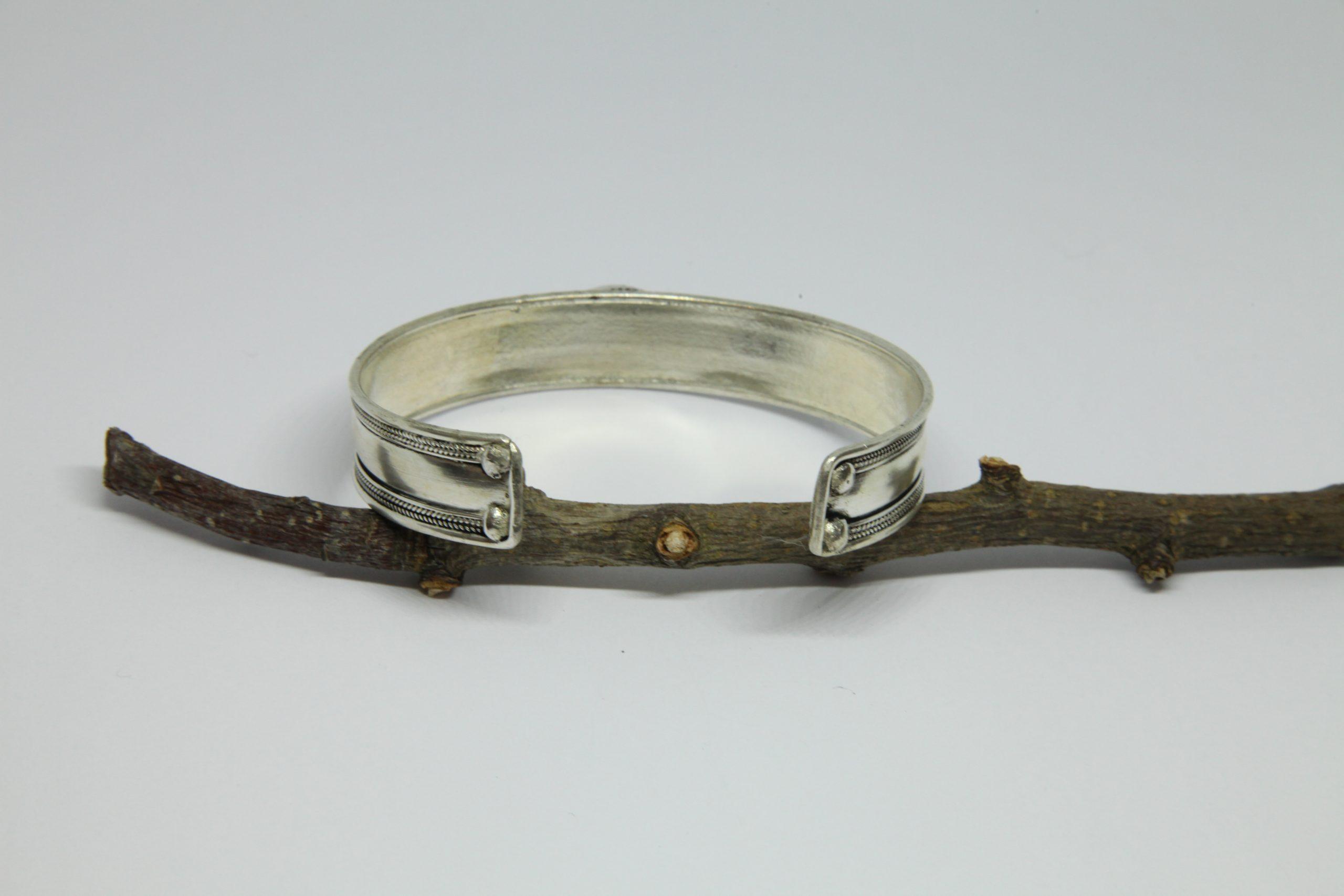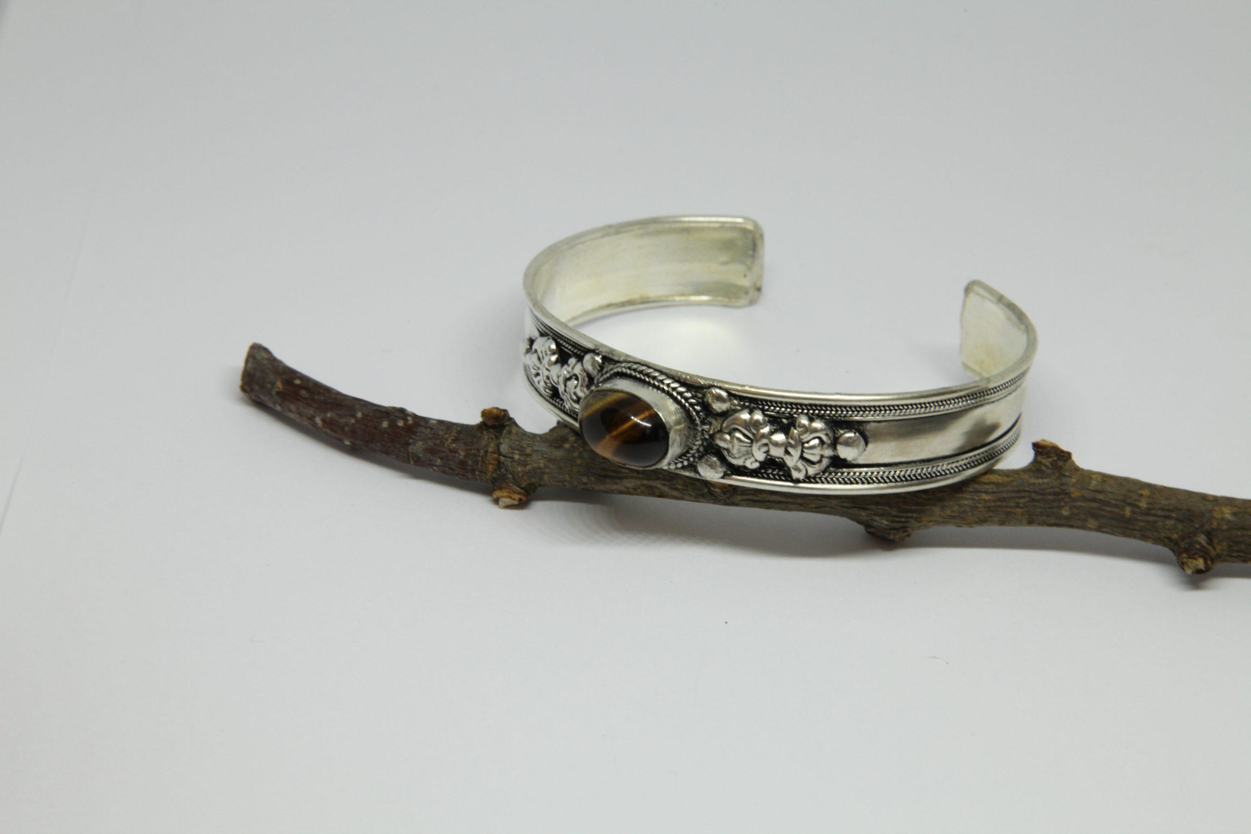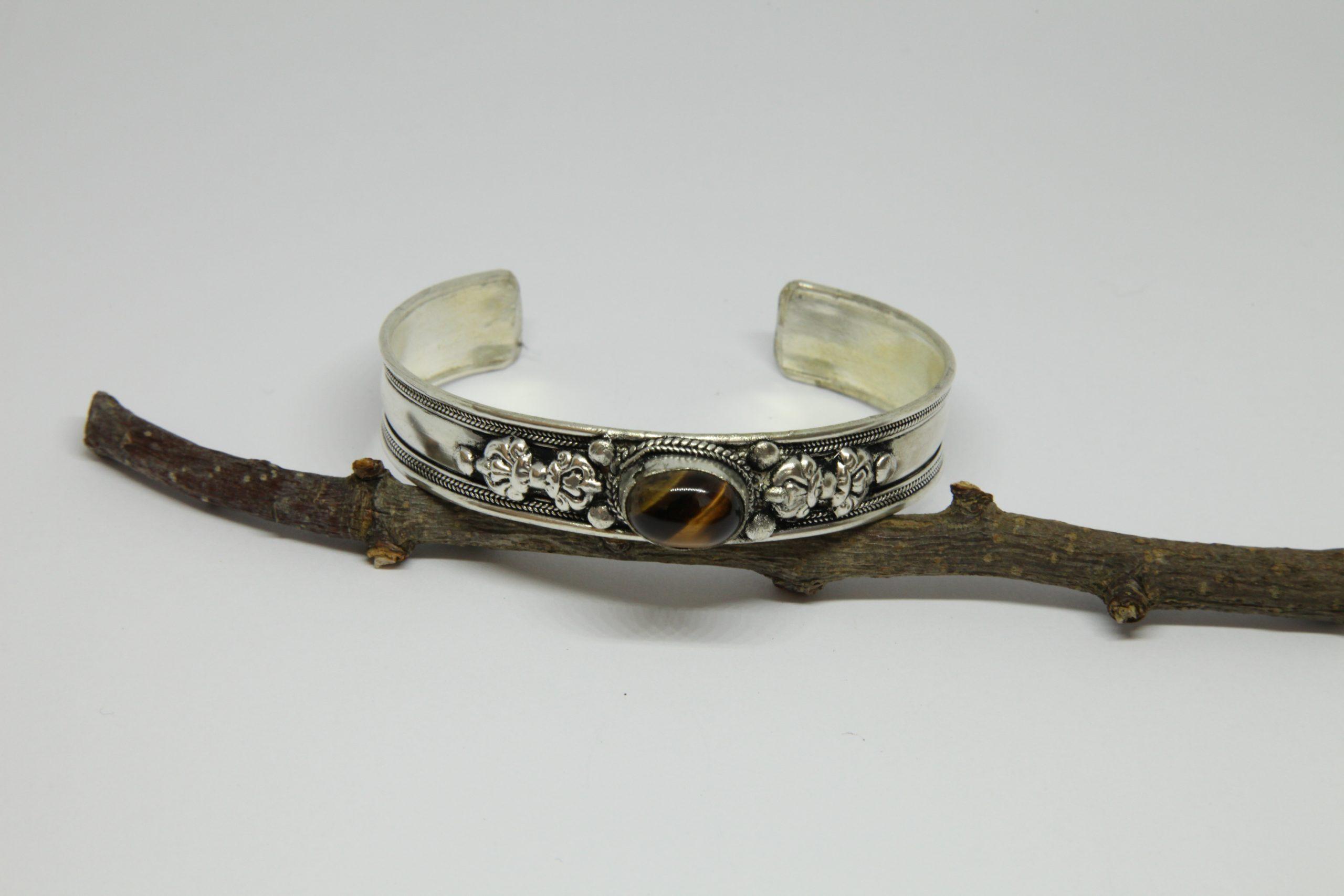 This is a stunning ethnic cuff bracelet. It is made from Tibetan silver (alloy: silver, tin, copper) and has a tiger eye stone in the middle. The bracelet is adjustable and but might be a bit loose for a very small wrist.