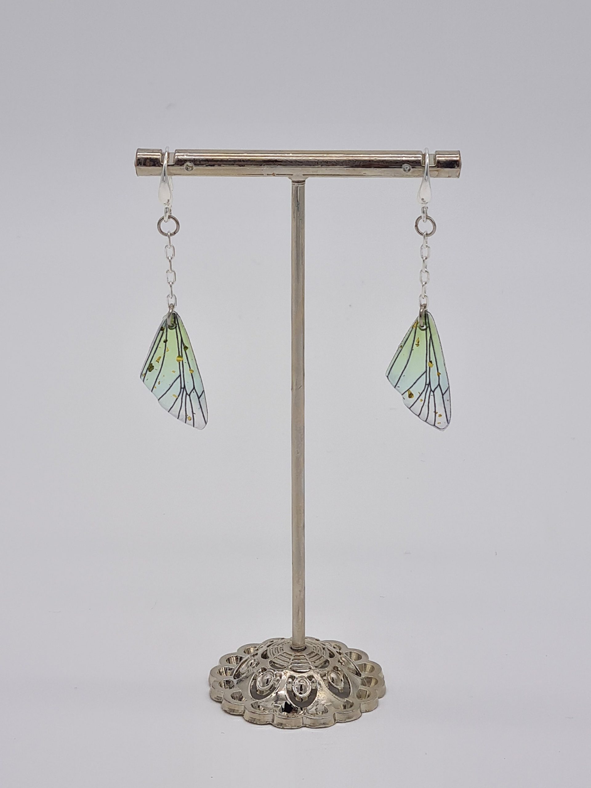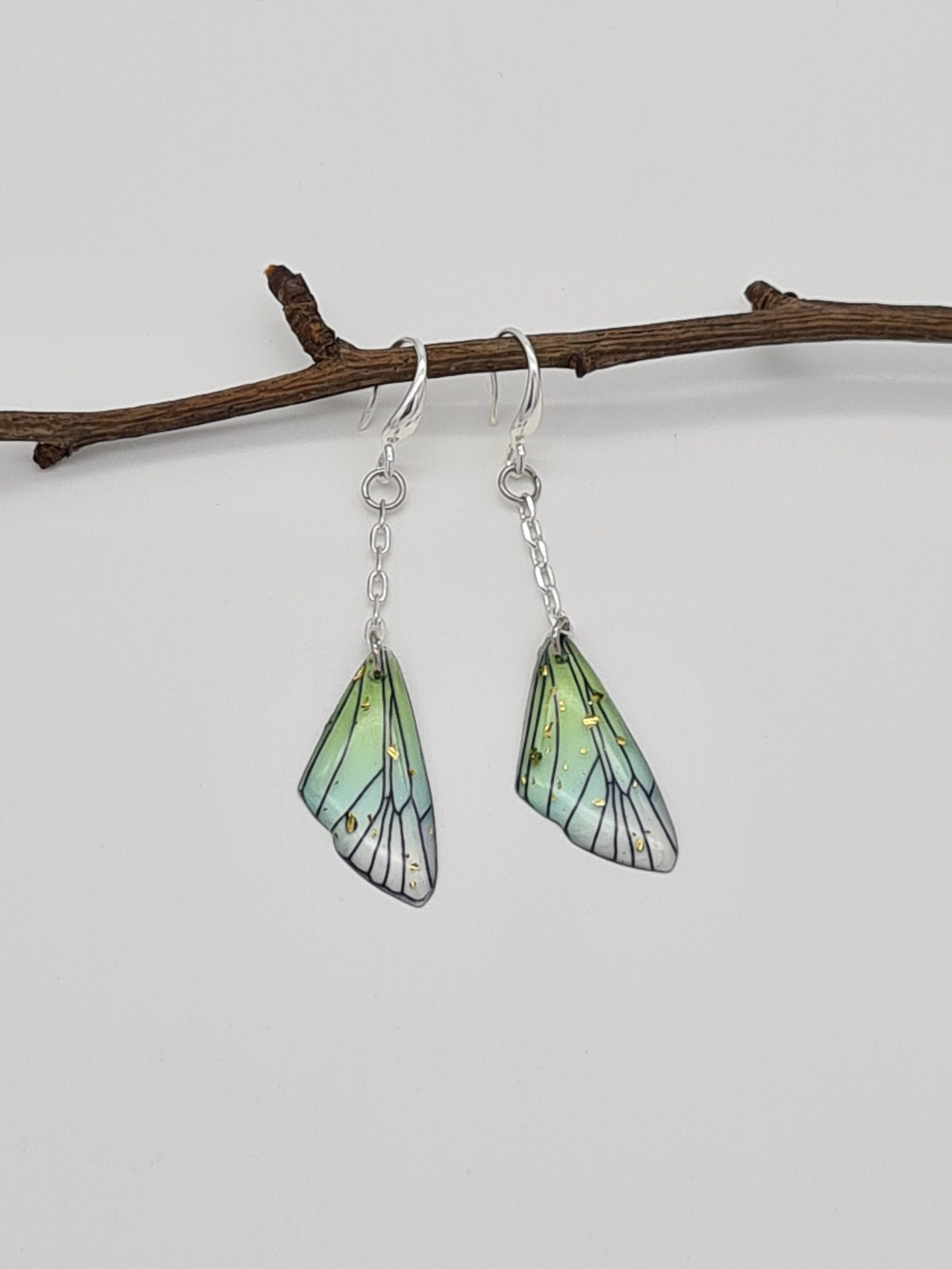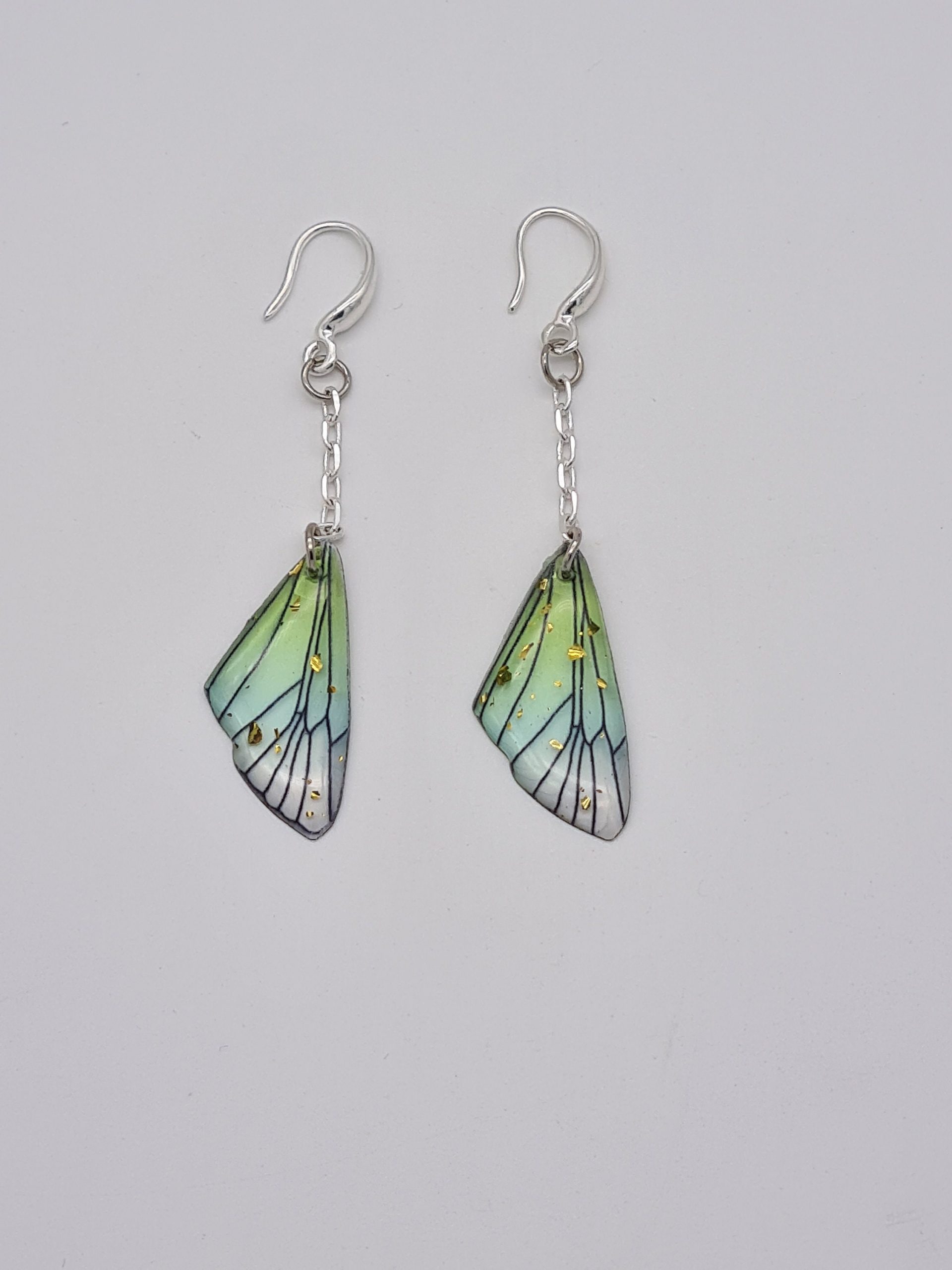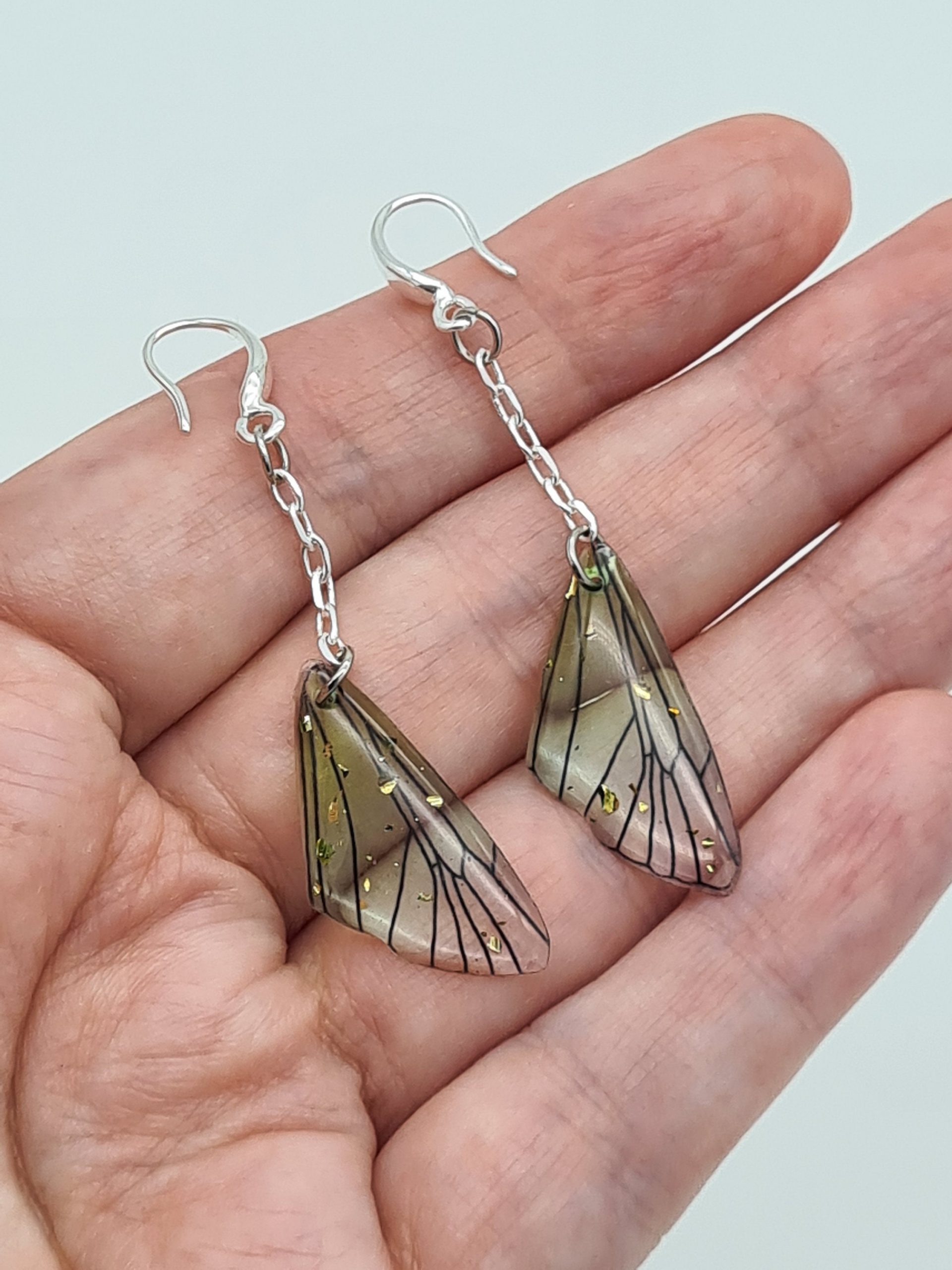 These are beautiful fairy/butterfly wings earrings. They are made of resin and have golden flakes inside.