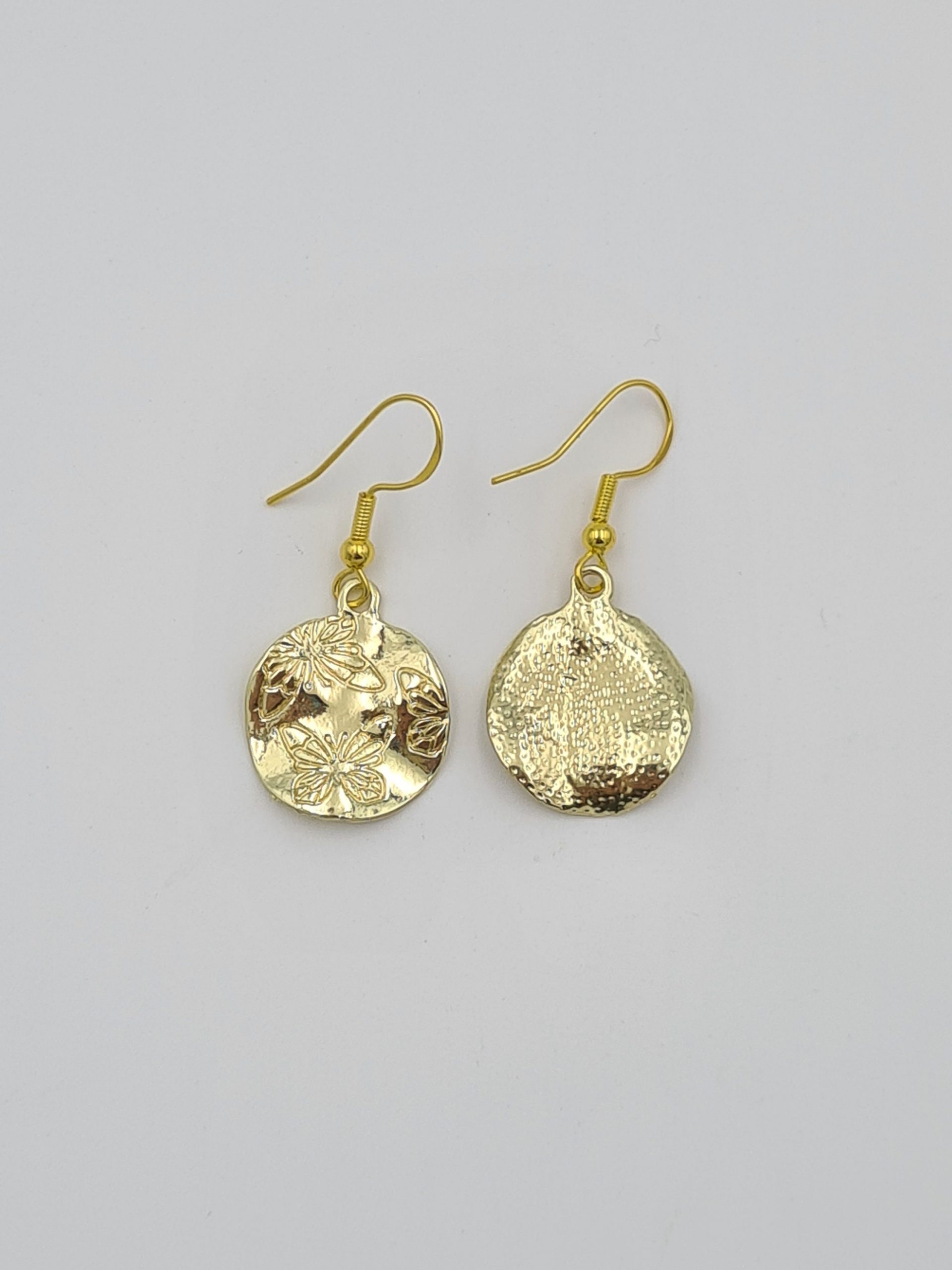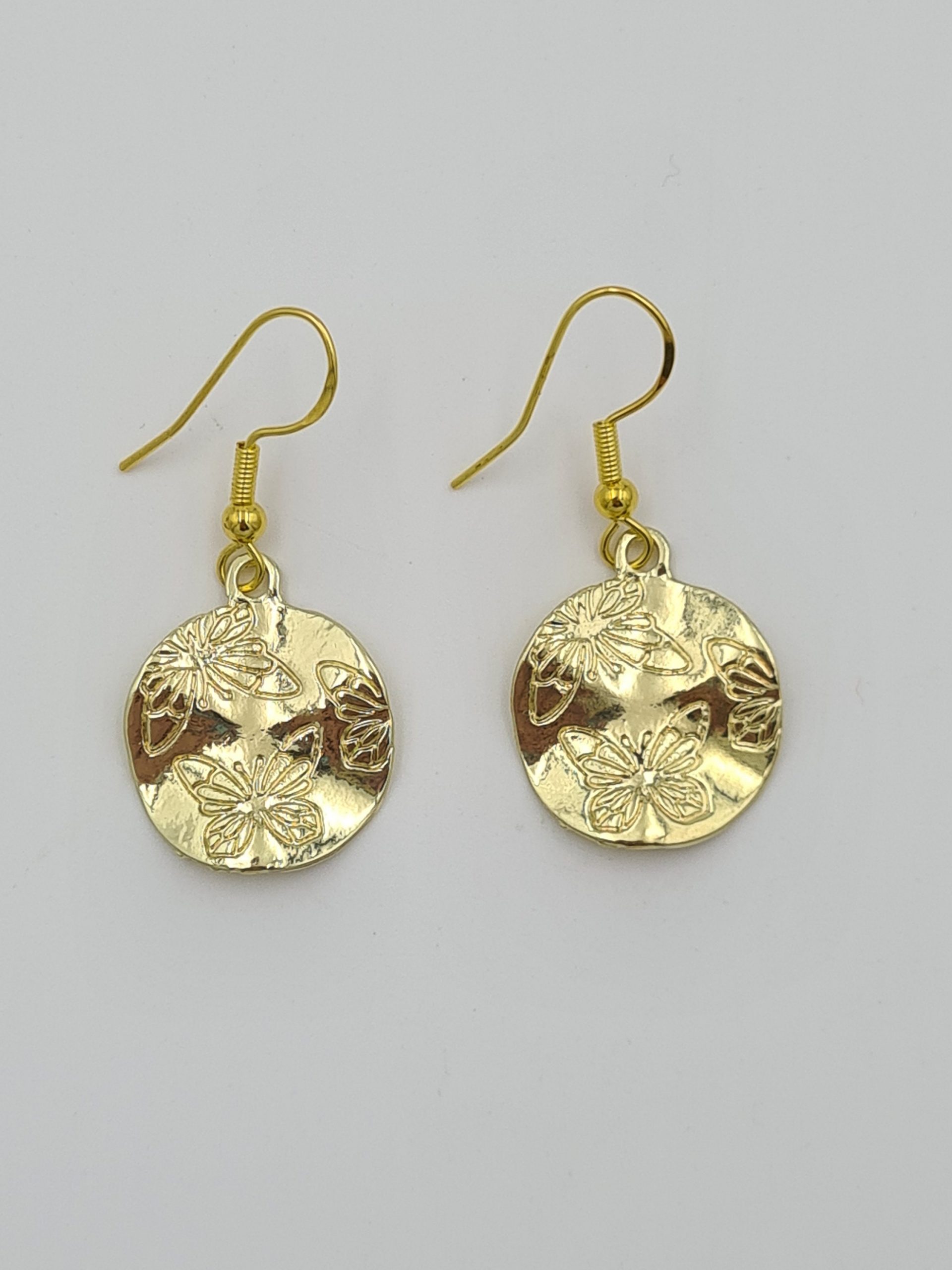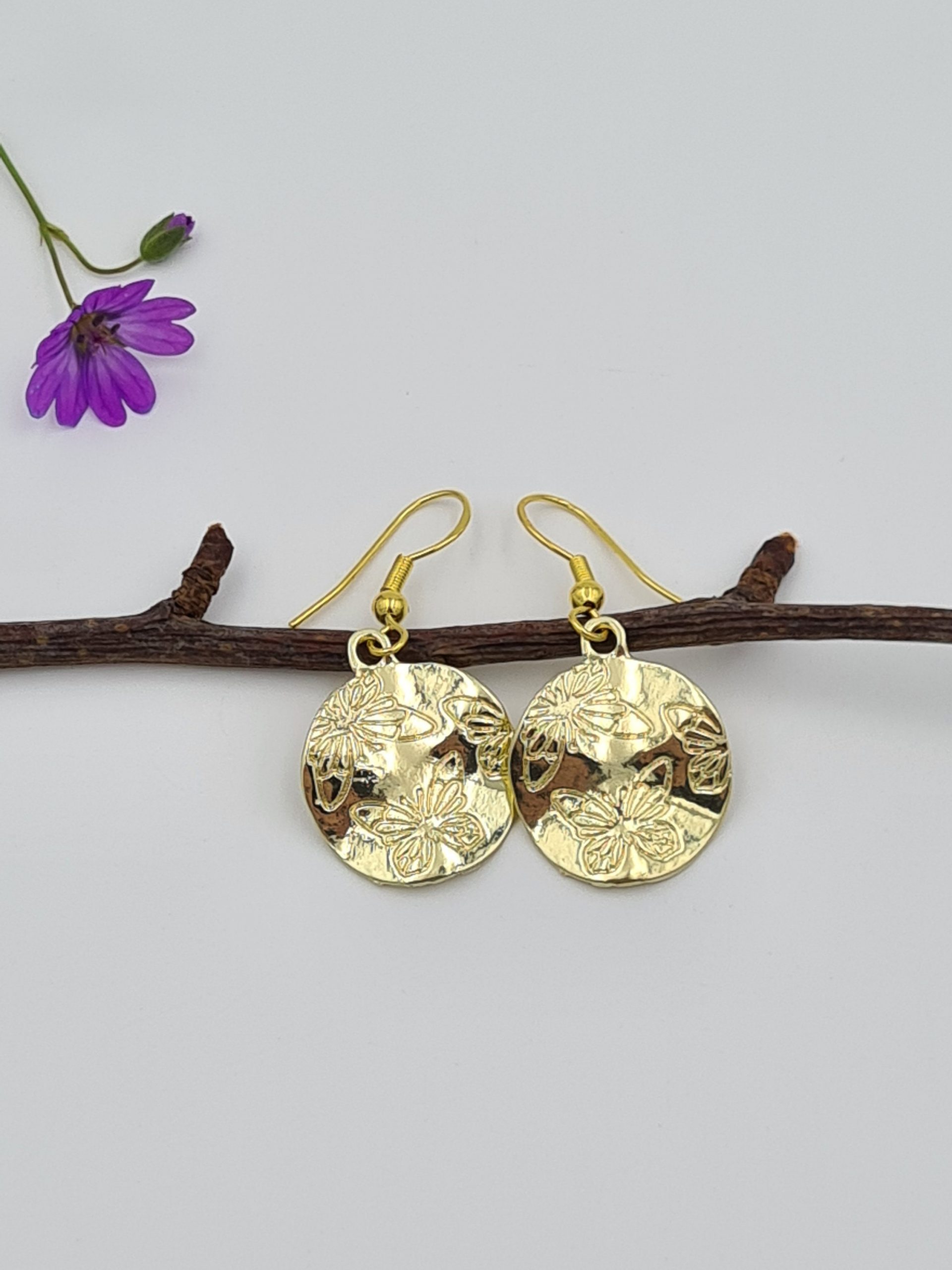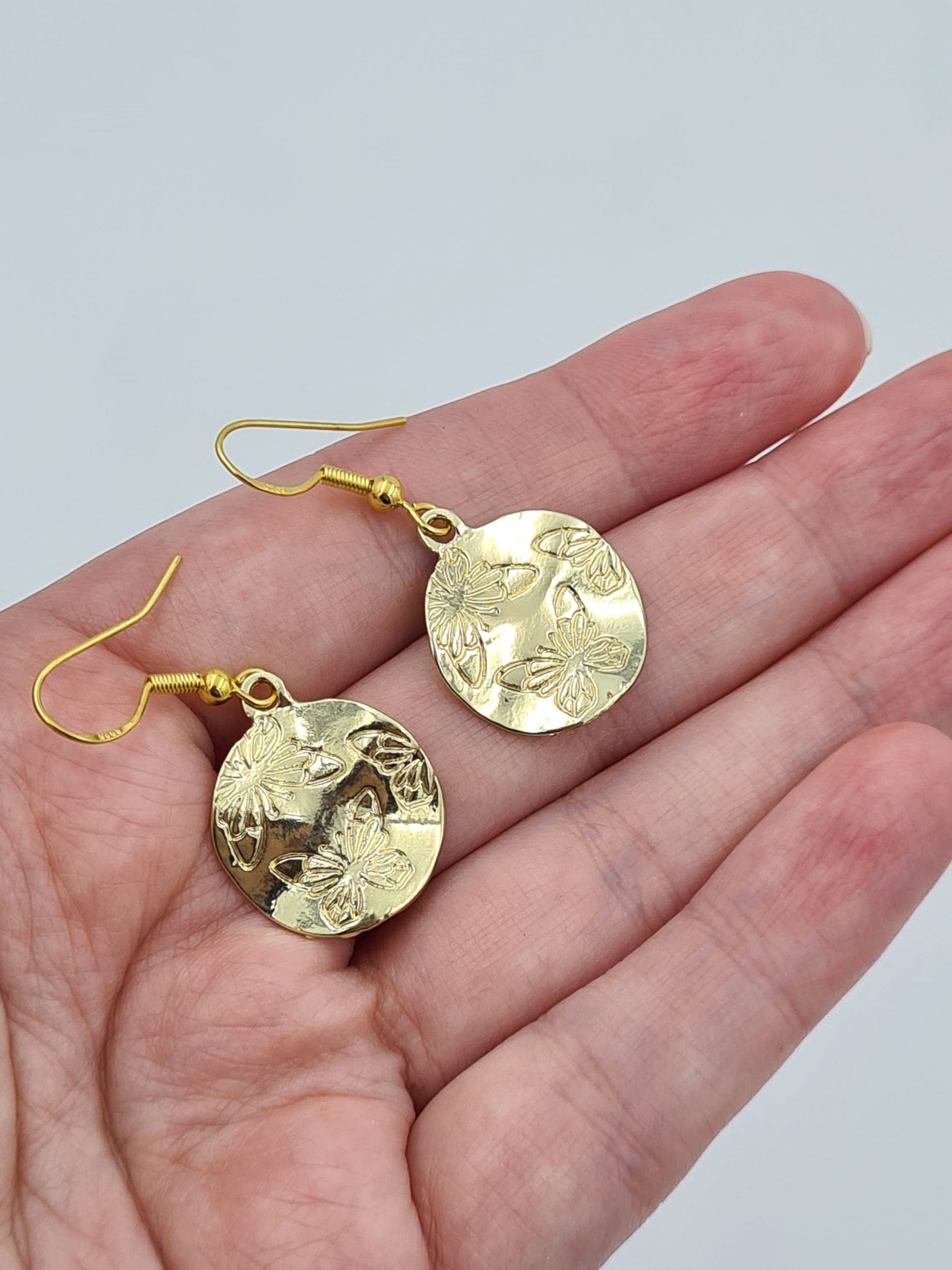 These are elegant gold plated earrings. The charms have butterflies engraved on one side. They look even better in real life and will be perfect for someone who loves boho style jewellery. They are very lightweight. Each pair comes in a pretty pouch and is ready to be gifted.