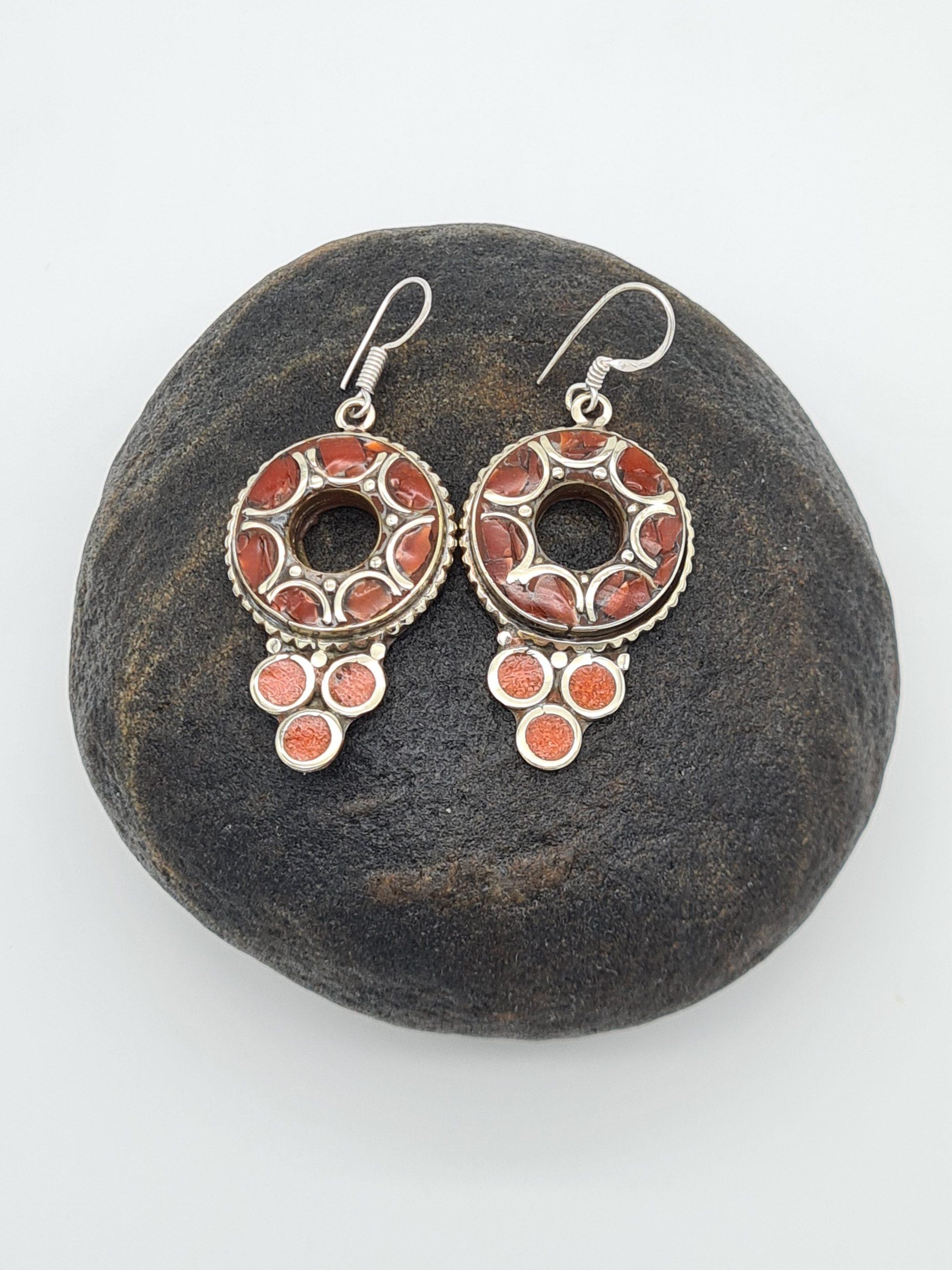 These are beautiful large Tibetan earrings from Nepal. This pair of earrings is handcrafted and created with Tibetan silver and completed with coral inlays. Each earrings has 925 silver hook.