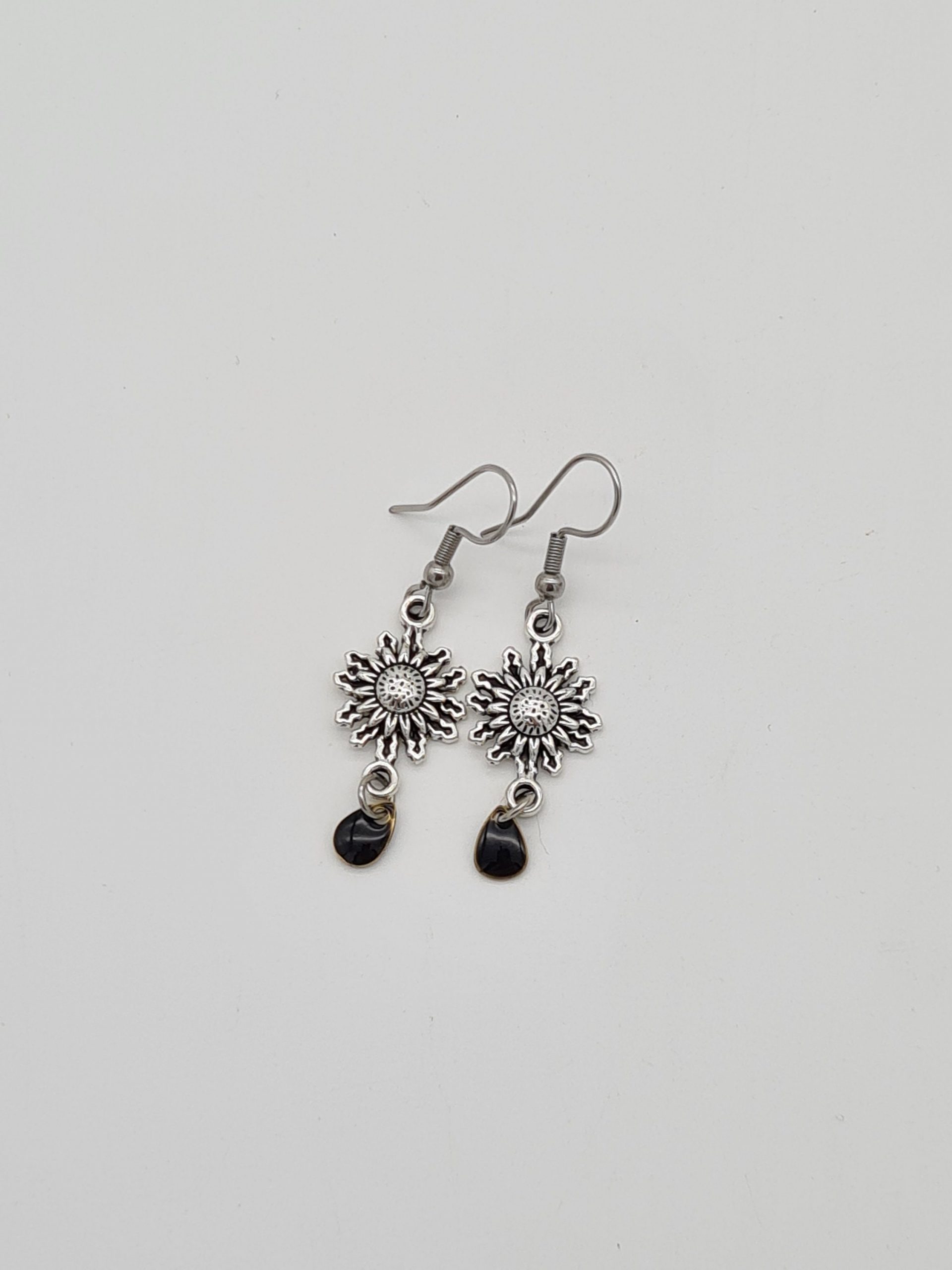 Elegant silver floral earrings which have a small black droplet at the bottom. Earrings are very lightweight and come with a small gift pouch.